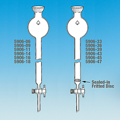 Chromatographic column with integral reservoir for connecting 5872 Flow Control Adapter. With 2mm bore, 1:5 taper solid PTFE stopcock plug at bottom. Available with or without porosity B (70 – 100 m) fritted disc sealed in. Order column, flow control adapter and clamp separately.