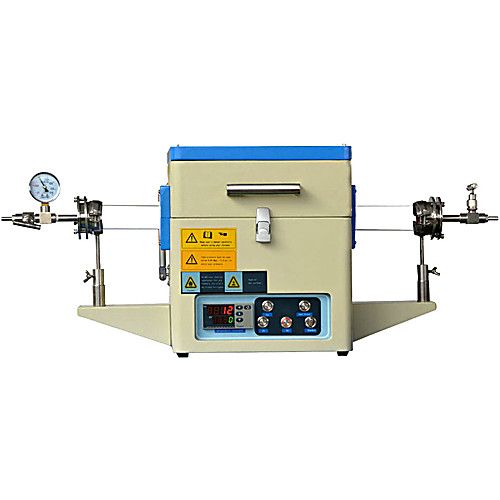 STF1200 50x600mm (OD x length) portable split tube furnaces feature spiral wire coils embedded in Mitsubishi (Japan) alumina fiber insulation. A double walled steel internal housing helps minimize heat loss to exterior surface. Furnace operation is controlled by a 30-segment digital controller. All our furnaces are CE compliant. Features Compact, portable and lightweight design. Split furnace chamber for fast and easy tube access. Standard package includes set of stainless steel vacuum sealing flanges with valves and pressure meter. Microprocessor based self-tuning PID control provides optimum thermal process with minimal overshoot. Multiple atmosphere processes in a single cycle are possible (ex: binder burn out in air and parts sintering under rough vacuum or inert gas environment.) Long life type K thermocouple. Safety Overheat protection shuts down the furnace if temperature is outside of acceptable range (refer to controller's manual) or when the thermocouple is broken or malfunctions. Power failure protection resumes furnace operation right after the point of failure when power is reestablished. Warning! NEVER fill furnace with explosive gases, including Hydrogen, Carbon Monoxide and Methane.