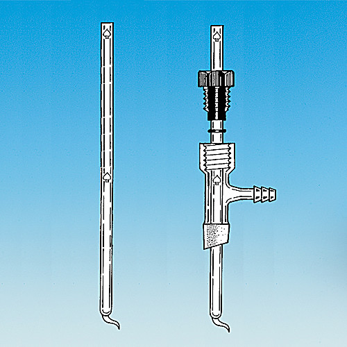 Micro cold finger condenser with drip tip on bottom for directing drops into the well of 14/10 jointed 9576 or 9599 Hickman Stills. Cold water is introduced into cold finger periodically by means of a Pasteur pipet. Complete item consists of cold finger condenser and multi- purpose vacuum adapter with #7 Ace-Thred that makes compression O-Ring seal with cold finger and allows for vertical adjustment. Threaded adapter supplied with Nylon bushing and FETFE O-Ring. Hose connection is size A.