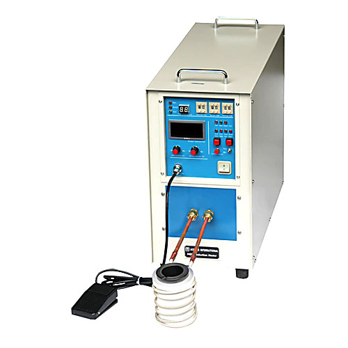 Across International IH series mid-frequency induction heaters are designed to operate between 30 and 80 kHz. Mid-frequency heaters are excellent for small parts heating, cutting, diamond tool brazing, soldering copper plumbing fittings, auto parts heat-treating, annealing of stainless steel containers and more. Mid-frequency induction heaters are the simplest in terms of design and implementation. With their low cost of ownership and maintenance, they are the most popular and reliable machines. The 15kW models are especially popular for their large power capacity and small footprint at an affordable price. This makes them standard equipment for many factories, labs and workshops where 230V AC is available. Main Features Ease of use: just plug in the power and connect the water cooling system, our simple instruction allows you to use the heater in 15 minutes. Light weight, portable (with handle), instant heat and up to 90% energy savings. Precise control with digital time and current displays. Remote foot switch for safer operation. Dual automatic and manual modes. Optional graphite, MgO and SiO2 crucibles available (melting material decides crucible type, weight and size of the material decide crucible size) Custom coil design available (fixed coil or coil on a cable so it can be used by hand like a wand) Frequency is non-adjustable, it depends on the coil design (diameter of turns, numbers of turns, copper tubing diameter and total length). ISO 9001:2008 registered manufacturer. We provide sample testing and custom made coils in our New Jersey facility. Safety Overvoltage protection Overheat protection: if sensor detects heat radiator temperature is over 55°C, machine will shut down, overheat light will turn on and buzzer will sound continuously. Increase water pressure or lower water temperature until alarm goes off itself. Overcurrent/malfunction protections: machine will shut down, indicator light turned on and buzzer sounds continuously if one of these situations occurs: One of the machine parts becomes overheated Interfering signal detected Short circuit between work pieces and induction coils Machine malfunctions Induction coils touching each other Input voltage is too low Low water pressure protection: if water pressure goes below 29 PSI, machine will shut down, water protection light will turn on and buzzer will sound continuously.