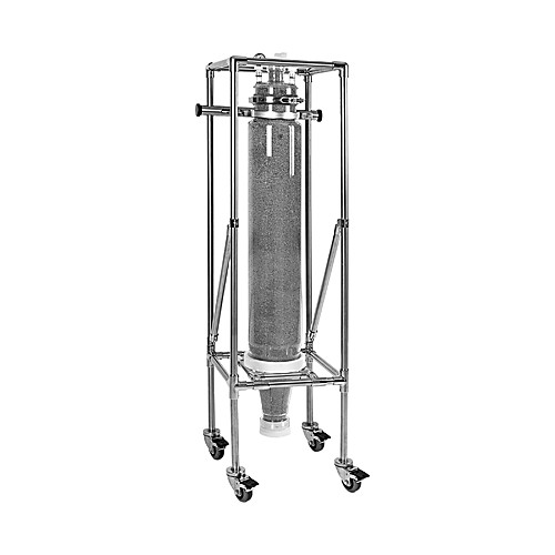 Stainless steel, four post support stand for large scale chromatography columns. Each stand is designed to fit either 24″, 48″ or 72″ length glass columns. Each stand has a PTFE collar at the bottom and an adjustable stainless steel collar at the top to support the column. All stands have locking casters for mobility.