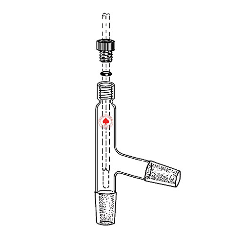 With standard taper inner joint at bottom and side. Top has #7 Ace-Thred for use with 5029 Nylon bushing and adjustable length thermometer. Supplied complete with 5029-10 Nylon bushing and FETFE O-Ring.