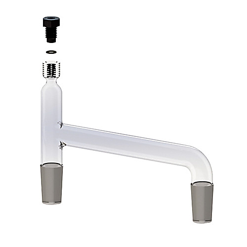 For connecting distilling column with vertical condenser. Top has #7 Ace-Thred for use with 5029 bushing and adjustable length thermo-meter. Side arm at 75 degree, vertical side arm 17.8cm from center tube. Supplied complete with 5029-10 Nylon bushing and FETFE O-Ring.