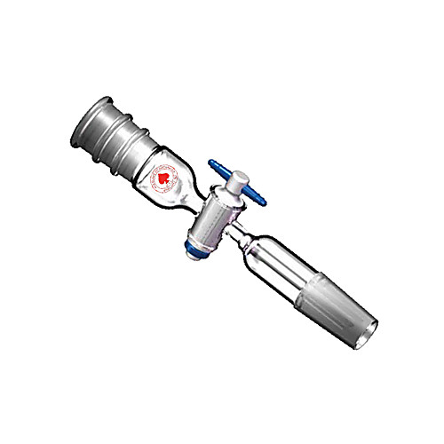 Straight connecting PTFE stopcock adapter with standard taper joints. Bottom joint connection has an inner drip tip tube.