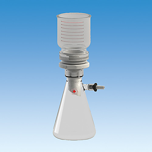 Borosilicate glass filtration apparatus accomodates 75mm membrane filters. The new design utilizes a PTFE Ace-Thred adapter to join the glass funnel, filter flask and fritted disc together. This design eliminates the need for the clamping device, stopper and base. The unit is easy to assemble, disassemble and clean. The fritted disc can be easily replaced and other porosity discs used. The apparatus is easier to use and more economical than old designs.