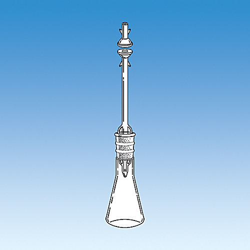 Used for limit test for arsenic as described in European Pharmacopeia, 1997, page 51. Complete consists of 125mL conical flask with 24/40 joint, a capillary chimney with a pulled tip below 24/40 joint at bottom, #5 O-Ring joint at top with hooks for 3/4″ springs, and an adapter tube with #5 O-Ring joint with hooks.
