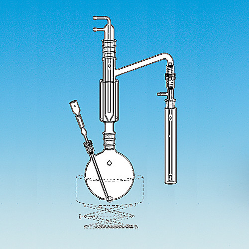 Used in testing for soluble and insoluble cyanides in water. Basically conforms to ASTM D 2036 (excluding modifications). Flask is 1L with 24/40 joint and #7 Ace-Thred permitting variable depth positioning of fill tube which has a float valve for added protection against boil back. Jacketed still head is lengthened for efficient condensing. Head and cold finger have a 29/42 joint and #11 Ace-thred on side arm. Two #11 bushings hold the threaded adapter to still head. 10-20m frit, 19/22 trap joint, and 8mm side arm threaded adapter.