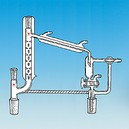 A compact fractionation unit for distilling small quantities in a vacuum, and for ordinary separation. Column is vacuum jacketed. Indents are positioned to cause the vapor to follow a spiral path, adding to the efficiency of the unit. Approximately three theoretical plates at 60mL/hr. Hold up to 1.2mL operating, 0.5mL static. Receiver capacity is 15mL. Three-way stopcocks achieve manifold arrangement making it possible to remove receivers without disturbing the euilibrium. 10/30 thermometer joints for 25mm immersion thermometers.