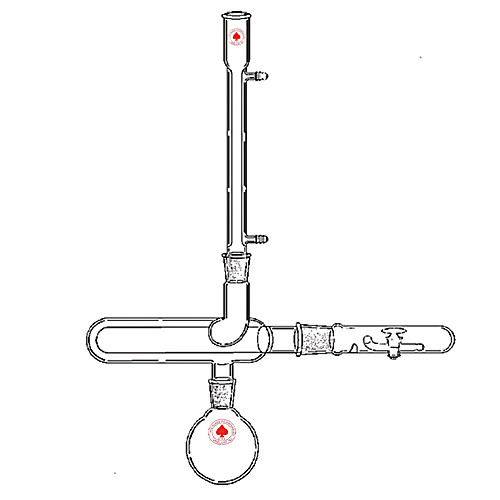 Vacuum. Desiccant tube has two-way action that permits the use of a smaller desiccant volume and better air contact with desiccant. During the final stage of drying, the T-bore stopcock is turned so that the evacuation path is directly over the desiccant, while in the early stages the desiccant is bypassed. The upper 24/40 joint is offset, condensed liquid does not drop over the inner tube. Opening to the inside cahmber is 40/35. Complete consists of condenser, drying chamber, desiccant tube with stopcock and round bottom boiling flask.