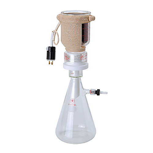 Filtration apparatus assembly. This apparatus differs from the standard units as it utilizes our Instatherm technology to evenly heat the upper 500mL filter funnel, thus keeping the viscous material such as polymers in the liquid state. The middle adapter and snap ring are PTFE. The interchangeable fritted disk is in the, 20 to 50 Micron range. The entire assembly can be taken apart for cleaning and the fritted disk can easily and economically be cleaned or replaced. Excellent for ASTM petroleum and biofuel testing protocols.