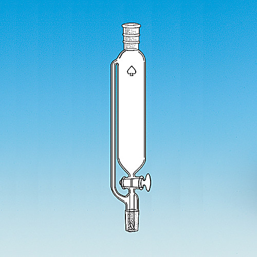 Cylindrical with standard taper joint top and bottom and drip stem. Stopcock has glass plug. Drip stem does not extend beyond joint, thereby eliminating possible source of breakage. For same funnel with 1:5 PTFE plug, see 9491.