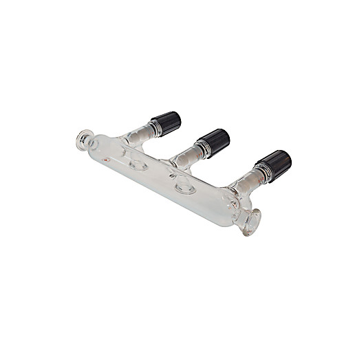 Single tube vacuum manifold with #15 o-ring connections on ends. Available in either 3 or 4 port configuration with 0-10 Easy Action stopcocks. Order with either 14/20, 24/40 inner joints or #15 o-ring joints on ports. Distance between ports is 95mm which allows for use of flasks up to 3 Liters. Please see our various o-ring joint adapters such as Ace codes 5127, 5128 and 5129.