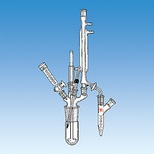 The flask is fabricated with an ACE 45/50 joint and is available in either 50 or 100ml capacity. Head has three 14/20 outer joints surrounding the 19/38 center opening. 8038 Trubore bearing. The agitator is a solid shaft with the blades shaped in the form of a half propeller. Rounded blades permit close tolerance with the flask bottom. The shaft is inserted in the bearing from underneath; design of the agitator is limited only by joint dimensions. The analytical still head with stopcock serves as a reflux condenser.