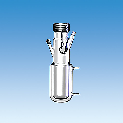Glass, jacketed reaction vessel design for use with our 7874 quartz and 7875 glass immersion wells. Instead of a standard taper joint, this reactor utilizes a height-adjustable, non-freezing #50 Ace-Thred. Also featured, a 14/20 angled joint for a sparger tube, a 24/40 vertical joint for a condenser and a #7 Ace-Thred for a thermometer. Vessel includes a flat-bottom that will accept the use of a stir magnet. Volumes indicated are total volumes; working volumes are approximately 40-50% of total volume.