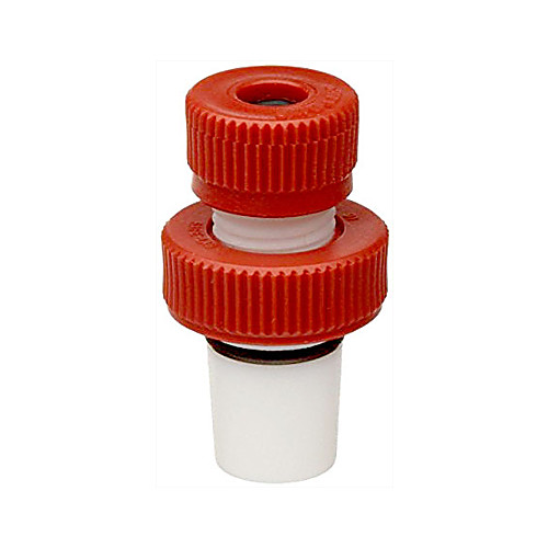 Thermometer adapter with PTFE body and Viton® O-ring for air tight vacuum work. Features Adapter has a threaded polypropylene screw cap on top with an inside O-ring for depth adjustment of 6-7mm for straight stem thermometers, glass tubing and other items Rotating the extracting nut removes the adapter from flask Not autoclavable Made in USA