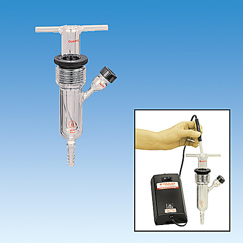 Similar to our larger units but is designed for carrying out reactions on a small scale, volumes of 5-15mL. Reactor body is fabricated of borosilicate glass with #25 Ace-Thred at top, 14/10 outer side joint externally threaded to allow an O-RING-CAP-SEAL connection with mating inner joint, and porosity E (4-8m) filter disc at bottom for use as a gas inlet to remove oxygen from the solution and/or for agitation (mixing). Bottom hose connection is size E. Immersion well is either quartz or borosilicate, 11mm I.D., with water jacket.