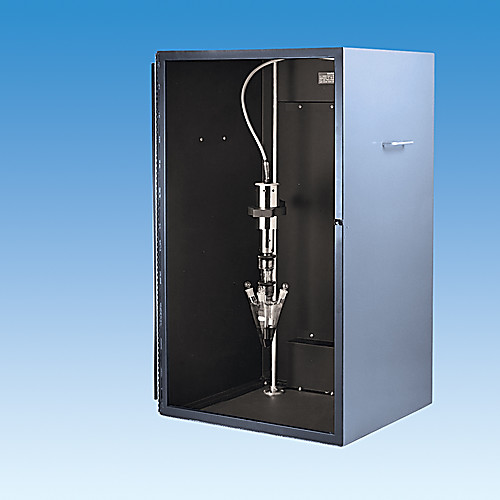 The sound abatement cabinet permits extended processing without discomfort by greatly reducing high pitched noise that is produced in ultrasonic processing by harmonics emanating from the vessel walls and the fluid surface. The inside of the cabinet is lined with sound abating foam. One hole at top for lead from power supply, two holes at bottom for water inlet/outlet, etc. All holes are covered with slit rubber. 1/2" vertical mounting rod located towards rear to left is for mounting ultrasonic reactor. Includes side handles, locking casters.