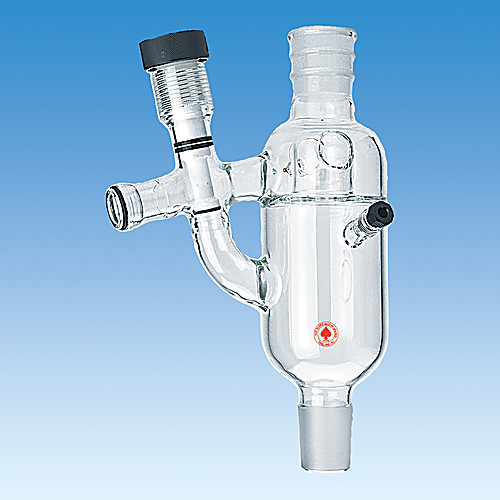 Large, reflux splitter installed between the boil-up pot or column and the condenser. A 0-20mm PTFE stopcock valve allows take-off when closed and reflux return when open. The take-off terminus is a 35/25 o-ring ball joint. The overall height is 350mm. 45/50 top and bottom joints. All o-rings are Kalrez for maximum chemical resistance.