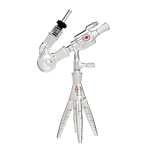 A short path still designed to be effective with high boiling point materials at low pressure where moderate foaming and slight bumping can be tolerated. A fine tip adjustable gas inlet tube can be used for stirring or as a foam breaker. One-piece cow