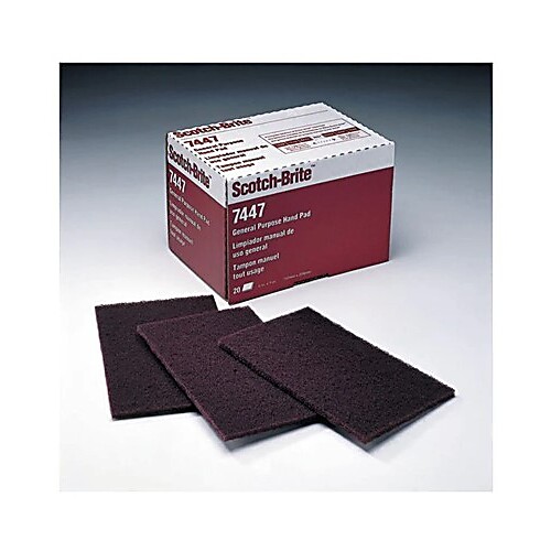 Scotch-Brite™ General Purpose Hand Pad 7447 combines flexibility with effective cutting action and precise hand control to accomplish tough cleaning jobs or produce fine finishing results, use after use. Very fine grade aluminum oxide abrasives cut fast and fine, leaving a smooth, finished surface. Suitable for use on a wide variety of materials and for many different tasks.